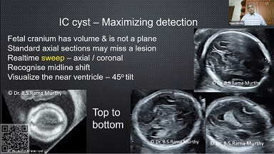Fetal intracranial cysts are detected due to their anechoic nature. Once seen, one should be able to assess the plane or structure from which they arise. Their size, shape, presence of luminal blood flow and associated findings aid in the correct diagnosis. Multiplanar neurosonography is the bedrock of imaging and is supplemented by MRI. This webinar deals with the ultrasound approach to a fetal intracranial cyst.